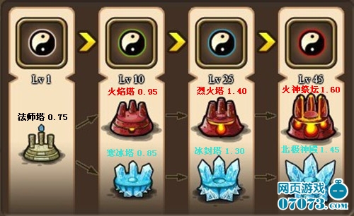 法师塔为单体攻击。两者比较而言,火焰类塔攻击力高,攻击范围略小,攻击速率较快,有持续伤害效果;寒冰类塔攻击力低,攻击范围略大,攻击速率慢,有减速效果。(后期推荐使用火焰类塔)