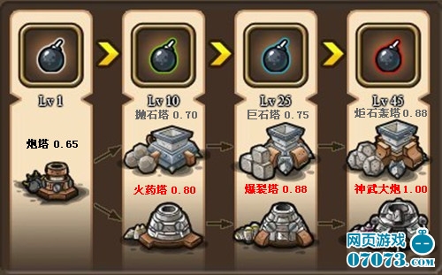 炮塔为群体攻击。两者比较而言,抛石类塔攻击力低,攻击范围无明显差异,攻击速率慢,有眩晕效果,眩晕时间随塔等级提升而增长;火药类塔攻击力高,攻击范围无明显差异,攻击速率较快。(后期推荐使用抛石类塔)