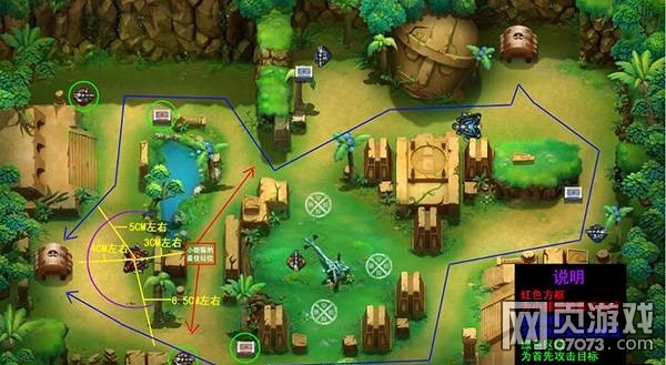 不知道大家有没有发现,游戏中所有地图的炮台无论是大炮台或者小炮台,首先攻击的目标是进入他攻击范围后直线距离和他最近的目标,或对他造成伤害的目标;也就是说2个人同时进入他的攻击范围,谁离得炮台的位置最近,炮台就会优先攻击谁。那么大家请看下图紫域和黄域的大炮台的中心点,再看下刚才讲到的小狸猫的最佳站位,看过之后相信大家会明白了吧,小狸猫的这个站位,只要蓝方坦克进到红方大本营区域攻击红方的大本营只要你站在紫色半圆画出的区域之外,那么你只要不去攻击大炮塔,那么大炮塔是绝对不会去攻击你的,因为我们的小狸猫已经为你们吸引了大炮塔的全部火力。大家请看图中黄域的几个数据,小狸猫的站位是离大炮塔最近,只有3CM左右,那么这个位置必将是大炮塔的火力集中点,嘿嘿相信看过此攻略之后,各位前去攻击红方大本营的玩家绝对不会在傻帽到冲进紫域去攻击他们的基地了吧。