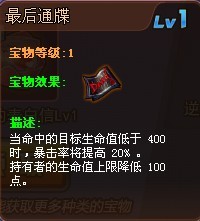 描述:当命中的目标生命值高于400时,暴击率将提高20%。持有者生命上限降低100点。