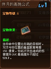 宝物描述:当你命中位置比你高的目标时,对方与你位置的垂直距离没差150像素,你此次攻击造成的伤害提升1%(最高提升不超过50%)