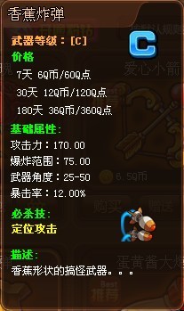 TNT弹道轨迹香蕉炸弹,TNT弹道轨迹香蕉炸弹攻击力,TNT弹道轨迹香蕉炸弹可控角度、爆炸范围、必杀技能、攻击力。