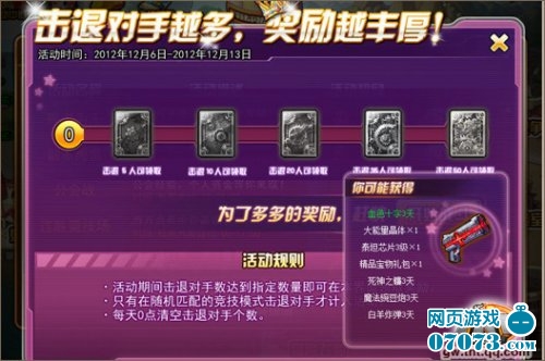 活动期间,玩家每天击退指定数量的对手就可以在活动界面中获得奖励。击退对手数量越多,自然奖励也就越丰厚。需要注意的是,玩家只有在随机匹配的竞技模式中击退对手才计入活动的有效击退中。没有时间限制,没有规则变化,无论什么时候,玩家只要按照要求击退对手都将记录在案。让每一个枪炮下的亡魂成为你强者之路的基石。