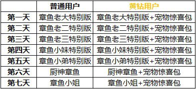 章鱼家族添加新成员啦,除了章鱼五兄妹,又来了厨神章鱼和章鱼小姐,收藏控们想得到嘛?快快参加玩小鱼吃吃吃的活动吧,同时黄钻用户每日额外领取一个价值49海贝的宠物惊喜包(包含宠物技能升级卷轴、经验小药水、攻击小药水各5个)