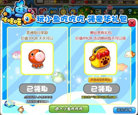 2、点击进入小鱼吃吃吃按钮,即可领取当日的章鱼家族成员,黄钻玩家额外领取一个价值49海贝的宠物惊喜包