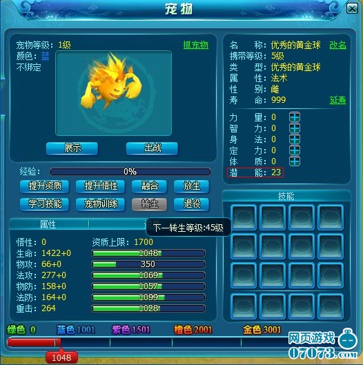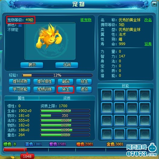 1)宠物每转生一次,宠物等级变为1级,同时转生等级增加。