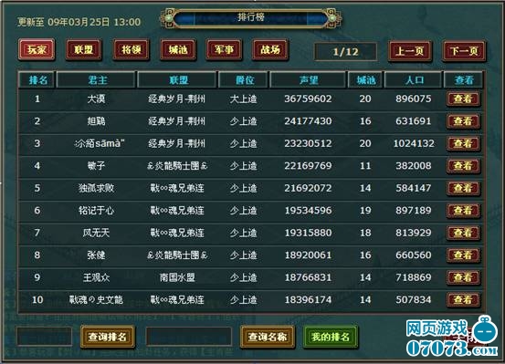 现阶段游戏中的排名共分为六种:玩家排名、联盟排名、将领排名、城池排名、军事排行和战场排行。其中,玩家排名和联盟排名按声望高低,将领排名和城池排名分别按等级的高低与人口的多少。