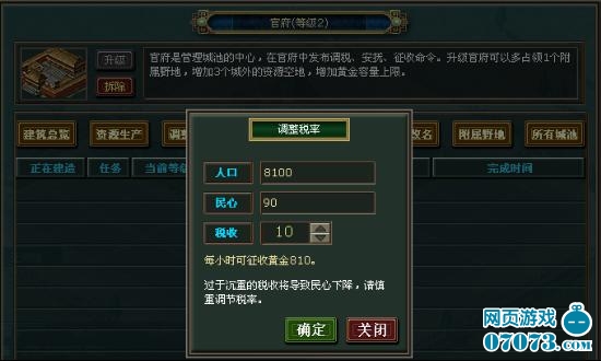在城内界面点击“官府”,弹出官府面板,可以进行税率管理。