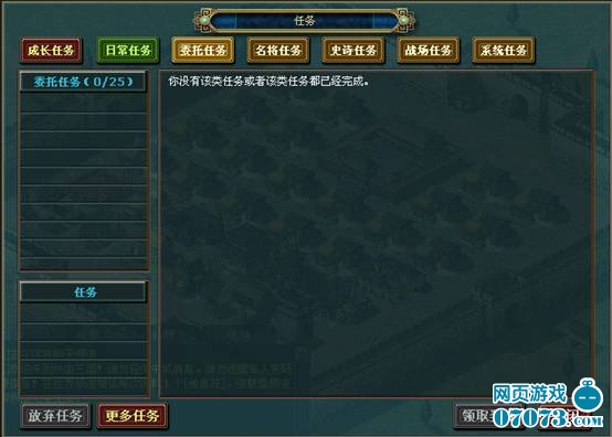 玩家在委托系统中接受的委托任务,都可以在“任务”中查看到。一名玩家最多可以同时接受25个委托任务。已经接受的委托任务可以被玩家主动放弃。点击“更多任务”按钮,可以直接进入委托面板,查看更多其他委托任务。