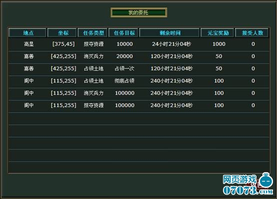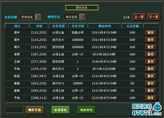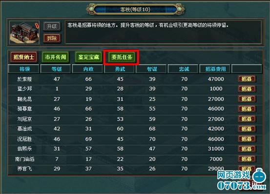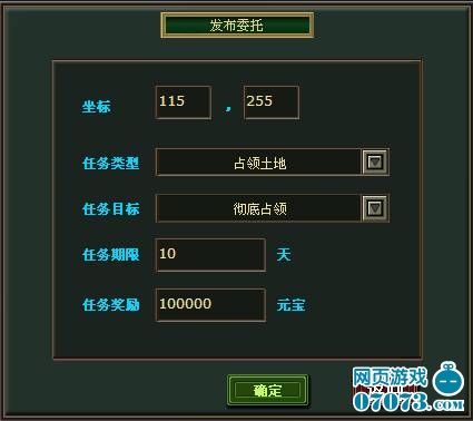 当玩家城池的客栈达到5级以上,爵位达到大夫以上,玩家便可通过委托任务系统发布或接受各种委托任务。