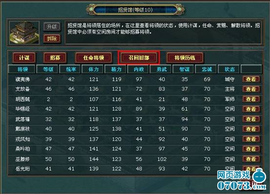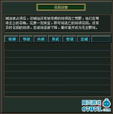 当玩家的城池被占领后,将领可能被他人抓走,也可能逃亡到野地。使用“召回旧部”,可以将原来属于自己的逃亡将领重新变成自己的将领。