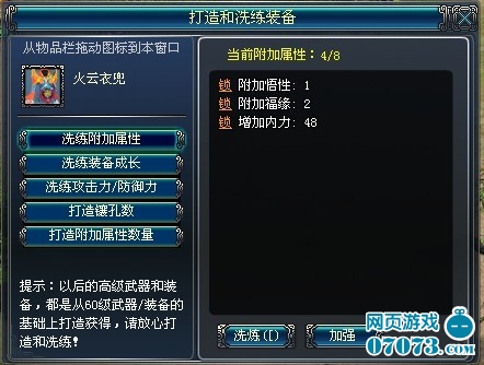 打造附加属性可以增加附加属性的数量,现在附加属性比较有用的就数臂力,生命,火烧,冰冻,定身,福缘,同一把把装备洗出这几种属性就比较完美了。