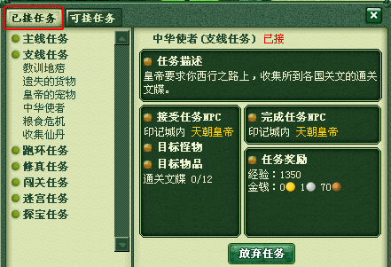 通过已接任务页面,点击“放弃任务”按钮,可放弃该任务。(主线任务不可放弃)通过任务列表,也可查看当前可接的任务。