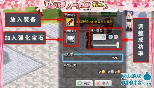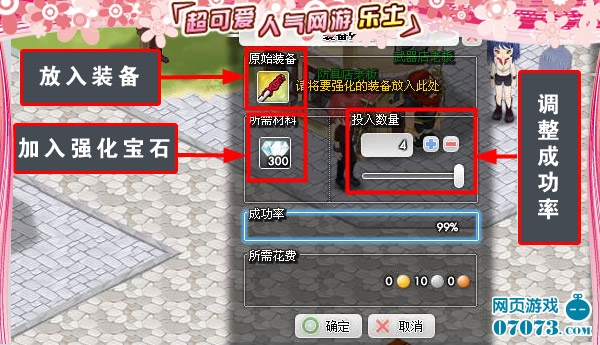 第二步,添加材料。打开装备强化界面之后你可以按照下图的提示放入装备以及强化宝石。你还可以选择强化宝石的投入数量,投入强化宝石的数量会影响强化的成功率,投入越多成功率就越高,最多可以投入4枚强化宝石。首次强化时,每枚强化宝石可以增加25%左右的成功率,4枚强化宝石可以达到99%,而强化等级越高时加入强化宝石获得的成功率就越低。