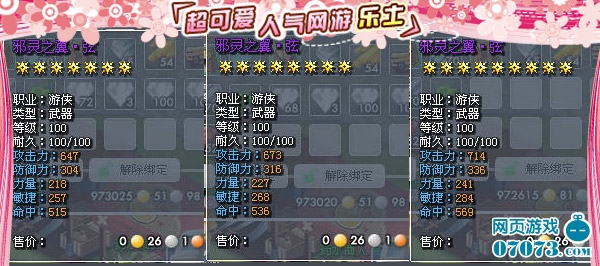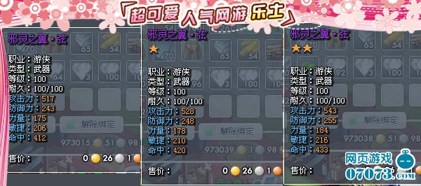 以游侠100级神器“邪灵之翼·弦”为例,未强化与强化一、二星之后的对比属性图如下: