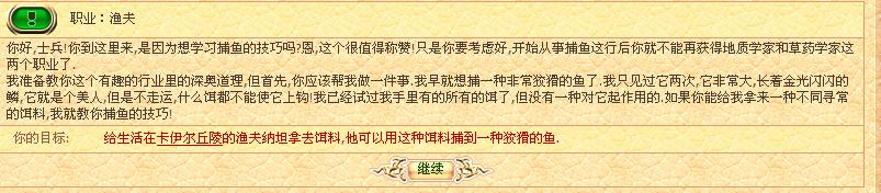 2.进到小屋后,看到绿圈里有感叹号,“职业:渔夫”点末尾的“继续”按钮