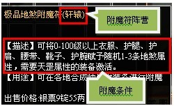 轩辕或是九黎(阵营的条件),需要玩家与附魔的装备同为轩辕或是九黎才可以达成,附魔的装备为哪种阵营在附魔符的最后是有说明的,如:极品地煞附魔符(九黎)就代表该附魔符,附魔后得到的装备为九黎,只有装备的玩家是九黎阵营的玩家才可以激活1个属性。