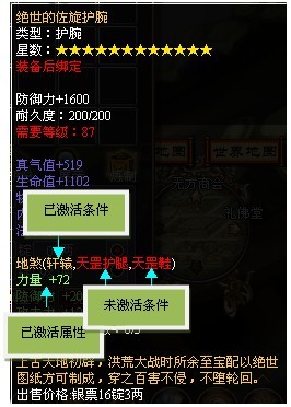 当您的条件已达成的时候该激活条件就会变为金色,并开启一条属性,3条全部激活的话提升的属性可是大大的呦。怎么样是不是已经跃跃欲试了呢?