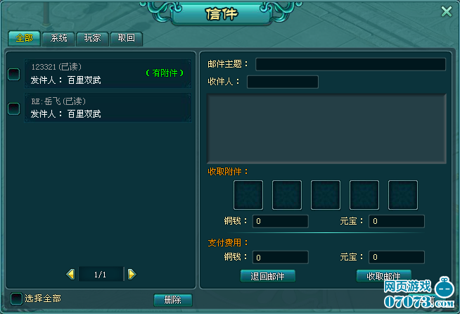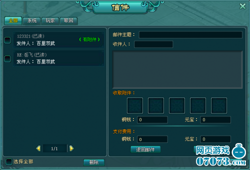 费用:发放1次邮件系统收取500绑定铜钱(不足则收取非绑铜钱,收到的信件不显示)