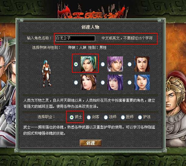 3、创建游戏角色、选择人物种族和职业种族:龙族高防御、狐族高智力、人族能力全面、对各种职业兼容性较强。