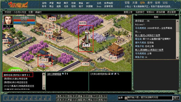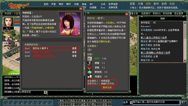 新手任务NPC:进入游戏系统推荐新手引导NPC任务栏、黄色字体为符合游戏人物当前级别任务、红色字体任务表示当前无法接收任务。点击查看任务介绍、任务要求、任务接收人、任务交付人和完成任务的奖励。
