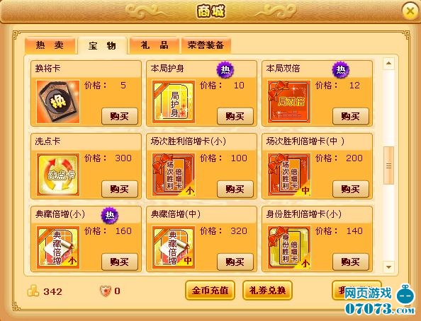 商城中可购买典藏倍增卡,使用后每局可获得双倍典藏。商城中可够买典将卡包,每个典将卡包可获取10个典将卡,比直接购买典将卡更实惠。VIP道具可提供免费典将的次数。