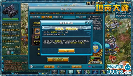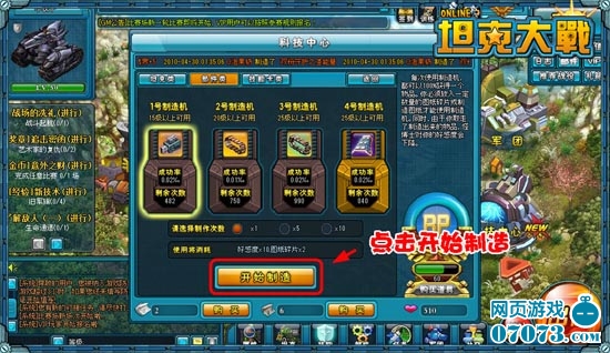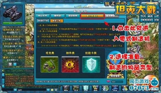玩家进入科技中心,点击【零式制造机】按钮进入物品制造界面,选择准备制造的物品类型,点击【坦克类】、【部件类】或【技能卡类】进入相关页面。选择好制作机后,点击【开始制造】即可完成物品制造。