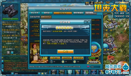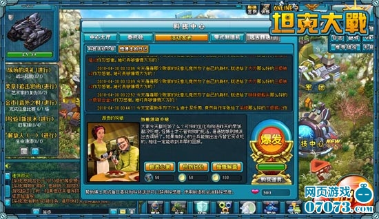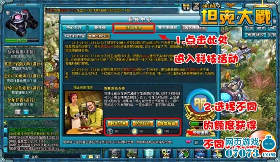 科技中心全天都会举行各类的科技活动,每隔半个小时还会更换一次新的科技活动,这些活动包含了方方面面的事情,从支持怪博士研究,到帮助照顾生化狗等等。参加科技活动需要玩家消耗一些数量的物品,包括:石油和金币(大家可以通过打战役、比赛等途径获得石油,可以通过完成每日训练任务免费获得金币)。参与科技活动大家将会获得多种奖励,包括:坦克、技能卡、材料、勋章、证书、大量的银币、好感度和RP值等。