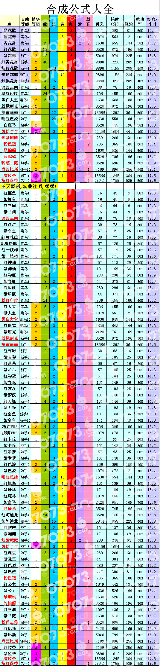 每种鱼,在基础成功率上,最多可以再附加50%成功率,即20%好友成功率和30%珍珠成功率!