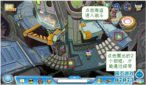 通过之后进入能源站,点击图中圈出的两个按钮,通过传送带,来到海盗面前。点击海盗进入战斗。这个海盗的宝宝有60级,推荐直接输掉算了,不影响任务完成滴,还会得到催眠球,不是更好么?