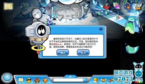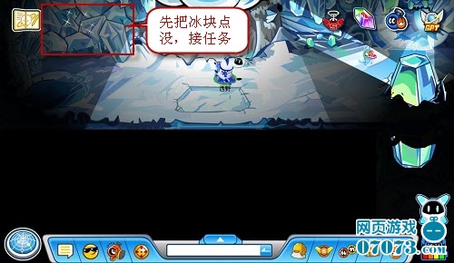 来到塞西莉亚星的寒冰溶洞,先点一下灯光,可以看到左上角闪闪发光的冰块。把冰块点没,可以看到卡卡,这时候就可以接任务了。接到任务之后再点一次卡卡,一段动画。