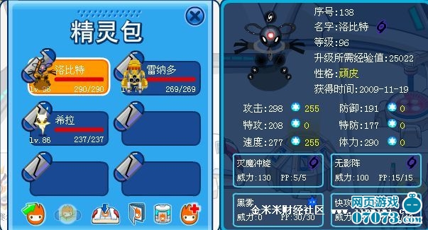 3、洛比特,主招“无影阵(对方体力小于1/2威力200)”,副招“黑雾(减对方攻击、特攻各1)”