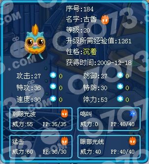 精灵古鲁的初始等级为19、20级,普通系。西野哥哥推荐先用30级左右的精灵将古鲁打到少量血,然后选择极高的精灵出场,再用精灵胶囊捕捉,成功率会高一些。RP无极限的小赛尔们可以无视西野哥哥= =。下面放出精灵古鲁的资料喽。