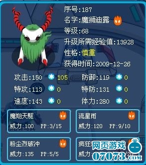再来看看BOSS魔狮迪露的资料吧。斯诺岩洞,普通系精灵,50级,体力3000000,体力小于1/4时使用任何招数会秒杀对方。(属性绝招也一样)