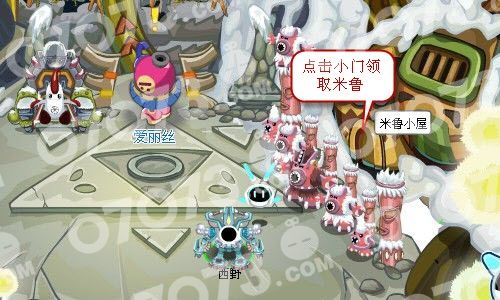 首先来到斯诺星,看到热热闹闹的冰系精灵争霸赛。其实哦,点击米鲁那个小房子,就可以领取精灵米鲁喽。点击位置如图。
