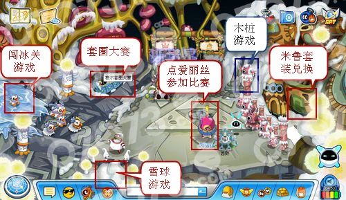 来到斯诺星,点击爱丽丝就可以参加冰系精灵争霸赛了。不过西野哥哥要提醒小赛尔们,一定要拥有冰系精灵,才能进行对战哦。对战小游戏是可以不带冰系精灵滴。所以哦,没有冰系精灵的小赛尔们就通过玩游戏得斯诺冰牌换奖品吧。看下图,图中标注了各小游戏的进入方法和精灵对战的方法哦。