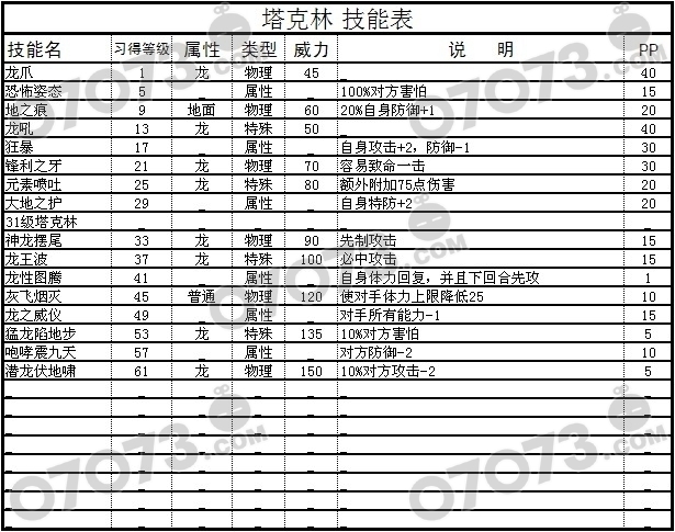 赛尔号塔克林技能表(由星·小羯整理提供):