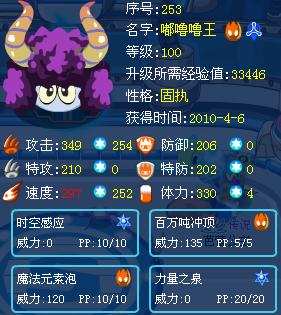 昨天看了圆圆的文章,可以消谱尼第一命的强化,就用小号试了下,发现嘟噜噜的时空感应是必中,就翻了翻仓库,找出一个29个体固执嘟噜噜刷满攻速并练满。