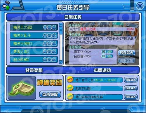 每日引导讲解了包括了很多内容。最上面是日常任务,左边是任务列表,右边是任务介绍和领取奖励的地方。按照任务介绍完成任务即可领取奖励。下面左侧是登陆奖励,登陆游戏就可以领取。右侧是本周还在进行的活动,其中标注NEW的是最新活动。点击活动右侧的现在就去可以直接到活动地点开始活动。