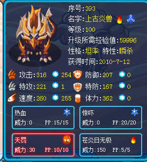 牛叉D炎兽我相信大家再也熟悉不过了吧(普NO阵容:哈哈,谢谢黑米的BUG 我:谢谢黑米的BUG,我不用被打了...),传闻中的秒团王...我的低个体- -(当时不知道啊),种族值也不低,可是...想秒团还是需要点RP,首先速度Ing(我当时想撞墙,我怎么会觉得这个性格好呢)其次,惊吓,这里要RP,不中就算下一次中了也不一定,because先手问题啊...(可能炎兽太可爱了,吓不死别人吧),然后热血(想发春)...随后,好一阵“无极”雨就下了,这时关于灭团。单挑嘛,狂妄(不是性格,是自己的心理)一点的,热血+大招伺候...谨慎一点的,吓了再说吧... 实用性(扫塔、打BOSS==):一般般吧,很少用。配招:热血、惊吓、天罚、大招。星级:★★★★