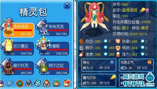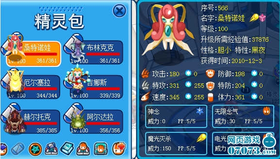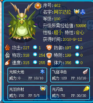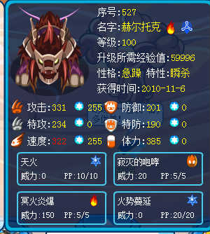 像恶魔的捣蛋鬼(真像鬼),够狠的。此精灵的个体系29,我当时没幻影助手,喂经验...测试...不行...再来....喂经验....测试...............................哎╮(╯▽╰)╭导致不能极品,还有就是一时的缺钱,没洗性格啊,郁闷...- -单挑很有实力,时间定格命中率极高,有兴趣的先定格,再强化杀之,遇到克的不用多说了——RMB专属技能煎了!!!秒团希望不是很大,虽然极限速度很快,可...不是最快(算不错的了——内心纠结)实用性嘛该用的时候就有用场了,像PN、该隐一样,这次的元素之战就是大功臣啊,定再杀,没有MISS!!!!