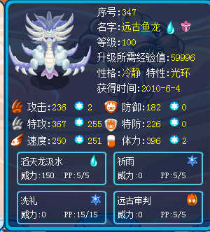 第一次看到我还以为是怪物...原来是个劲野(这里我想问一下浅蓝,暗潮是不是先手?),牛啊。遇到大招特工又没有消强化、没带消强化、心理战术不消强化的祈雨然后“扫荡”就OK了,丽莎祈雨后冰系那招解决,还算厉害...不错不错,小童鞋值得称赞...遇到物攻的就凭能力喽,特工特高(我太冷静啦,哈哈)直接搞死,搞不死就吃屎喽,同系的强化杀之。实战嘛,很适合打勇塔哦...当时本人就是用鱼龙+闪光爱菲亚扫掉当时最高的60层哦!~~~打BOSS也没话说...配招:祈雨、大招、洗礼(冰系绝招)、RMB精灵技能远古审判。 星级:★★★★☆