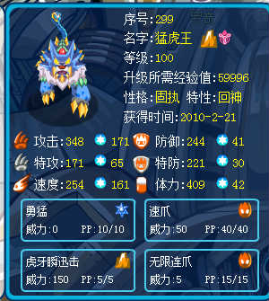 由于当时买时不知道什么事学习力...- -所以...不过运气好啊,固执+29个体(不幸中的大幸),纯属有勇无谋型的老虎,蹲仓库吧,不过还是有可用之处的!!种族值不低不高,攻速、攻血随便刷,威力照旧,本人做过小测试...盖亚基本一招秒,就算不行+先手(虽然威力小,但盖亚已经苟延残喘),还有——亮点大招的附+...15%速度+1,这样RP帝的话就爽了(不解释)。单挑没话说,OK!灭团,希望渺茫啊,除非RP把!综合胜率70%。算不错了- -...配招:大招、强化、先手、RP技》星级:★★★★