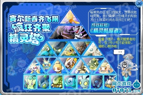 而稀有精灵,也是精灵塔活动,获得精灵酷爱者称号的基石!收集到这些精灵,并且利用多余的精灵组成五只进化精灵,再加上雷伊和盖亚,到了2月17日,就可以领取精灵酷爱者称号了!