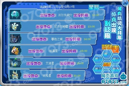 下面是稀有精灵的出没时间,每周一到周日7天各不相同,13只稀有精灵会轮番出现。下面是具体的出现时间表。