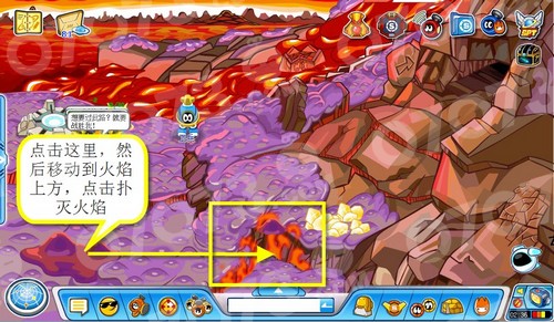 然后来到火山星,先点击左下角的泥沙扑灭火焰。同时还要躲开火炎贝。