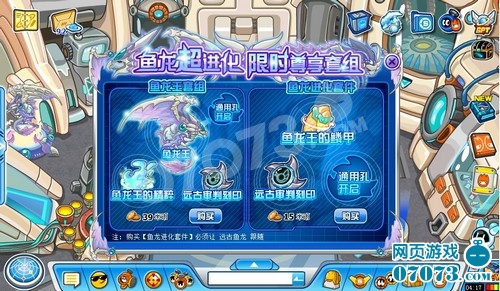 赛尔号鱼龙王超进化需要小赛尔们首先拥有远古鱼龙。然后花15米币在精灵实验室的右侧点击鱼龙王的装置,购买鱼龙进化套件,就可以进化了。如果还没有鱼龙王,小赛尔可以花39米币购买鱼龙王套组,同样可以拥有鱼龙王。西野哥哥之前完成了本周的鱼龙王任务,之后才看到这个更新画面,因此不能确定是不是只有完成任务才可以购买。如果购买不了,小赛尔可以选择查看西野哥哥的最新攻略:赛尔号鱼龙王鳞甲 赛尔号鱼龙王的传说攻略>>>