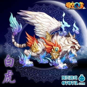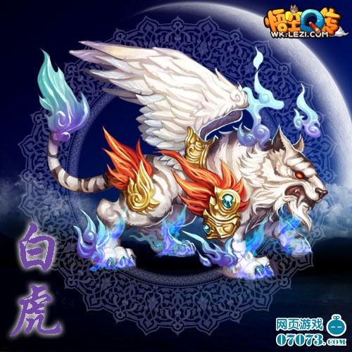白虎操控龙卷暴风之力,色白,属金,镇守西宫星宿。《悟空Q传》中的白虎乃百兽之王,雄壮威武,四肢上的盔甲抵御着一切外来攻击,还有那锋利的爪子似乎能够撕裂一切。瞧!它正在那儿虎视眈眈地看着你,利爪微曲,似乎正打算向你发起攻击!