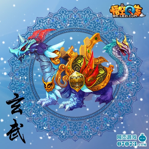 玄武操控寒冰风雪之力,色黑,属水,镇守北宫星宿。《悟空Q传》中的玄武乃龟蛇合体,盔甲附体,抵挡着一切外来的攻击,生长于极寒之地,寿命极长,没有人知道它到底活了多久。悄悄地说句,它的化身似乎一直都在默默地守护着傲来国!值得一提的是,它的灵性非常之高,傲视群雄,凡人无法驾驭它。