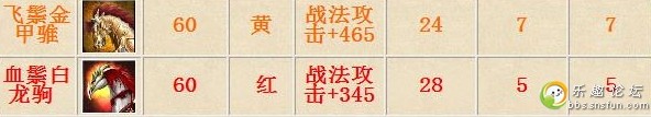 可是老玩家在面对上面两匹战马的时候,一般会选用黄马!注意,这里的60级的黄马初始属性为465,而红马则为345。两者相差120。红马成长点为32,比黄马的28要高出4。也就是说两匹马要都升级到30,才会攻击点数相同。更进一步,红马强化到60级时候与黄马强化到65级,输出点数相同。